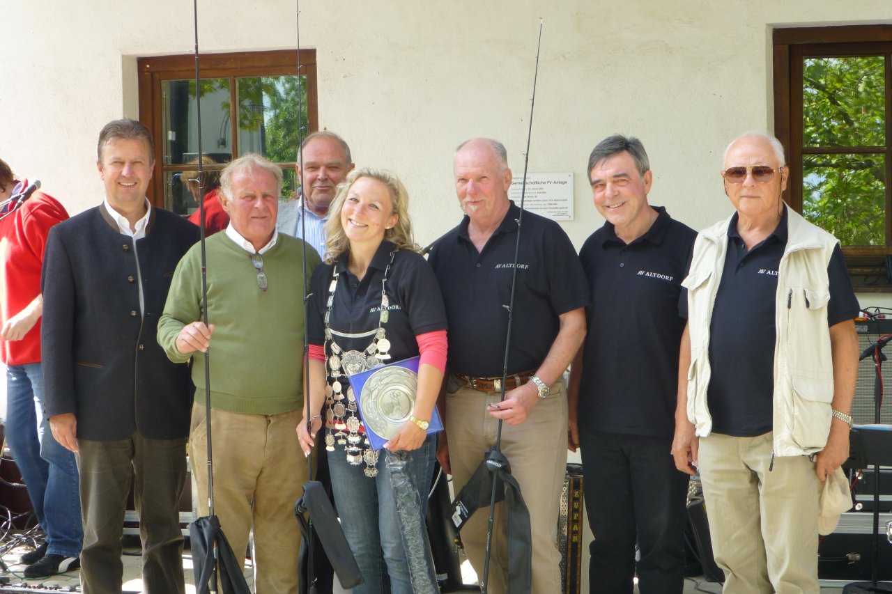 V.l.: Bürgermeister Helmut Maier, 1. Vorsitzender Anton Maier, Präsident des Fischereiverbandes Niederbayern Dietmar Franzke, Fischerkönigin Bettina Schäffer, Helmut Mirlach, Hans Scharf und Karl Blechinger