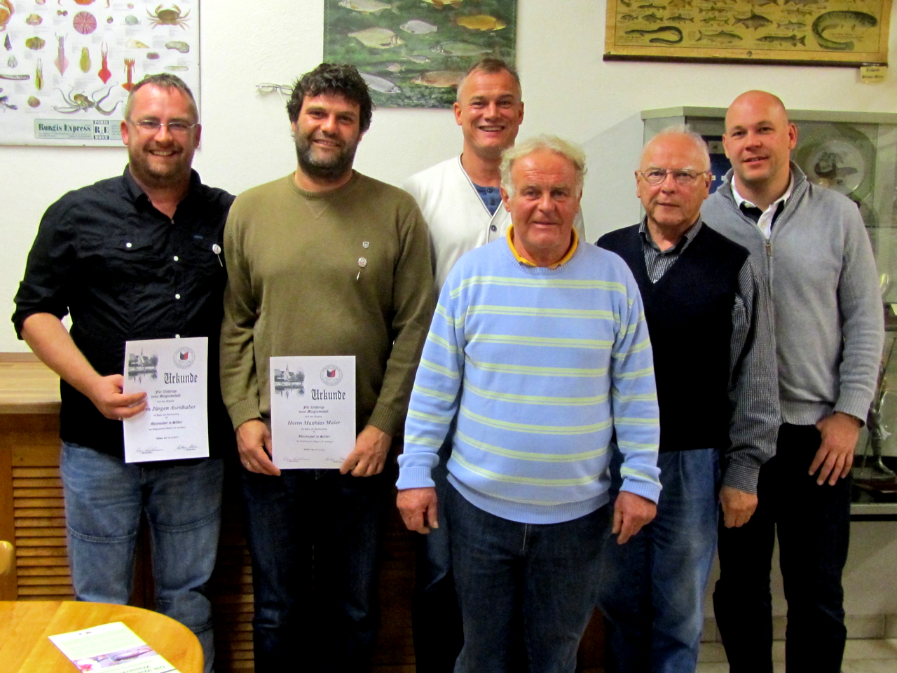Für ihre 10- jährige Mitgliedschaft wurden Manfred Kahl, Rainer Lakner, Benedikt Priller, Sebastian Regia, Simon Riedel-Reidemeister und Marco Walter mit der bronzenen Ehrennadel, für ihre 25- jährige Mitgliedschaft Jürgen Asenhuber und Matthias Maier mit der silbernen Ehrennadel des Anglervereins ausgezeichnet.